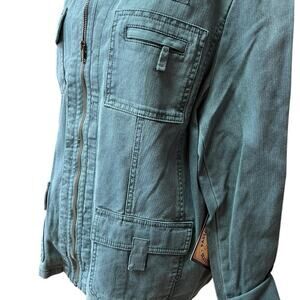Caribbean Joe women’s jacket size XL. Features a full front zip with a standup collar and one button, two front chest pockets.; one with flap and button, the other with a small zipper. Also two lower pockets with flaps and Velcro. Top of the shoulders have a tab with a button for accent. Lightweight. Made of 100% cotton.