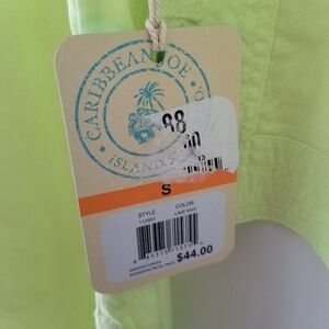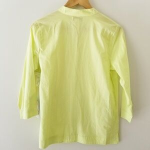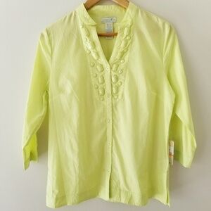 3/4 sleeves construction with Mandarin collar and embellished be neck provides both casual comfort and I pleasing good looks. A 100% cotton. Size small. Color is Lime Kiwi