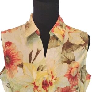 Caribbean Joe Sleeveless Hawaiian Button Top. Great top with beautiful floral design with pleated back & pleated on each side in front. Cotton/polyester blend