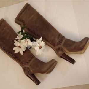 These Marina are a gorgeous pair of boots with lots of details. They are suede in the color taupe.