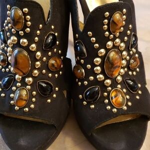 Black suede feel upper bejeweled in gold studs and stones
