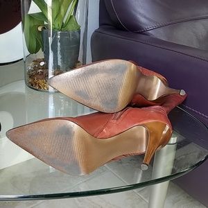 Gently used,leather, mid calf ,stiletto boots. Ornate buckle around the ankle and zip closure, made in Brazil.
