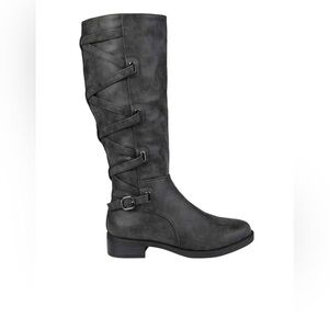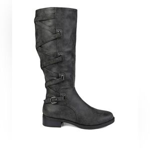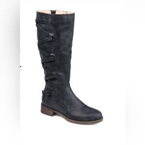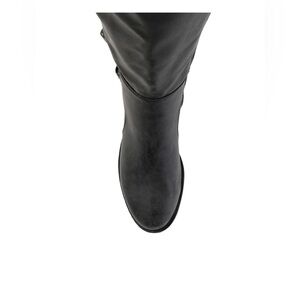 A clever zig-zag detail adds a contemporary look to this riding boot. This charming almond-toe knee-high silhouette features smooth vegan leather uppers, an inside zipper, and an extra-wide calf size for a custom fit.