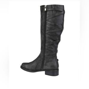 A clever zig-zag detail adds a contemporary look to this riding boot. This charming almond-toe knee-high silhouette features smooth vegan leather uppers, an inside zipper, and an extra-wide calf size for a custom fit.