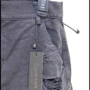 CARMAR OD CARGO SKIRT WITH STONEWASH AND GRINDING MINI Faded Black skirt with distressing. Has several pockets and pockets with snap closure. Light weight. The belt loop on the left side did come undone. Took pictures. It’s a size 12 but it runs small. It’s more like a small medium. Waist flat across is about 15in.