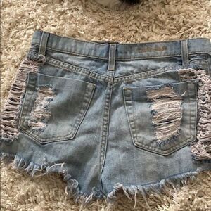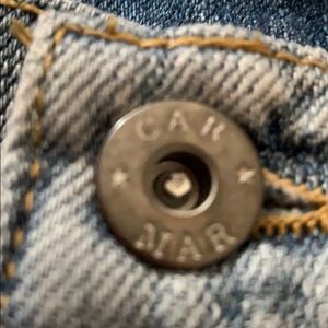 These button up Car Mar distressed shorts are hard to find. Fringed bottom, medium colored denim. Size 28.