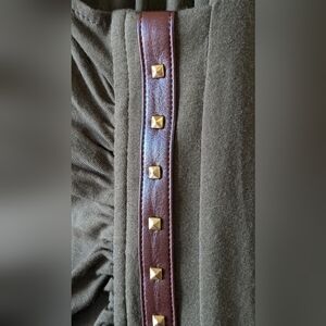 This olive green dress is so dreamy- it's so soft and smooth, and the brown faux leather trim with the studs elevates this dress to give it a flair.