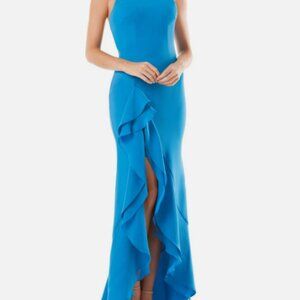 CARMEN MARC VALVO Infusion Peacock Blue Cascading Ruffle Hi-Slit Maxi Gown 6 US