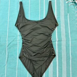 CARMEN MARC VALVO Olive Green Side-Beaded Ruched One-Piece Swimsuit