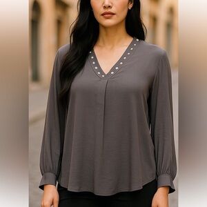 ❤️Grey V-Neck Studded Women's Top. This elegant top features a studded neckline, perfect for any occasion. The soft grey color adds a touch of sophistication to your wardrobe. Drapy , roomy , front with a very silky feel. 100% poly that’s machine washable. Brand new with tags! Looks and feels like silk❤️ Measurements are 21” ptp, 27.5” length