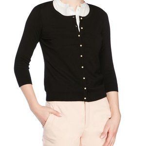 This is a gently used Carmen Marc Valvo 3/4 sleeve black pearl button cardigan.