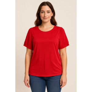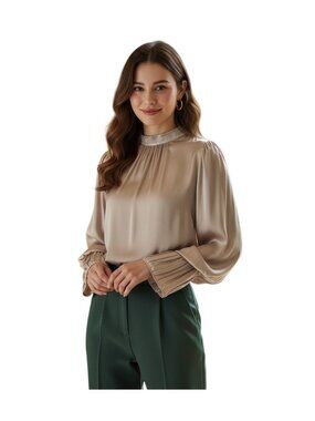 Ruched mock wrap bodice with long sleeves. Zipper detail on the side.