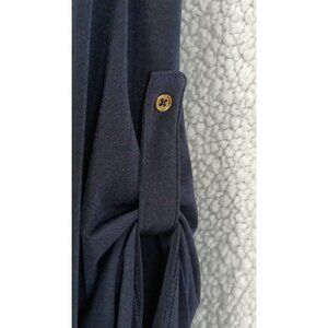The CARMEN Marc Valvo Women's Blouse in Plus Size 3X is a navy blue button-up top with a collared neckline and long sleeves that can be worn with a roll tab design. Made from a blend of polyester and spandex, this blouse is perfect for any occasion with its solid pattern and relaxed fit. The addition of a buckle accent adds a touch of flair, while the stretch material ensures comfort and easy care through machine washing. Handmade in Vietnam, this blouse is a stylish basic piece for the warmer seasons of summer, fall, and spring.