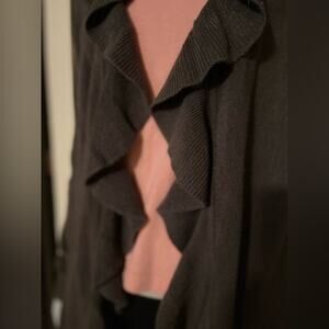 CAROL ROSE Long Gray Open Cardigan w/Ruffle Trim sz M