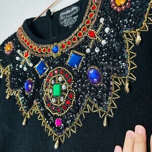 CAROLE LITTLE Vintage Jewel Embroidered 100% Black Wool Sweater Size Large