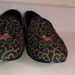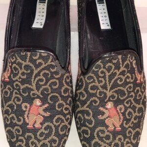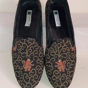 Women's size 8 flats from CAROLE LITTLE. These unique slip-ons are tapestry look with scrollwork and monkeys design. Black leather trim. In excellent condition with very light wear. Black leather strip on heel has a scrape on one shoe--not noticeable. Please see photos and ask questions prior to purchase.