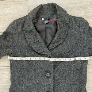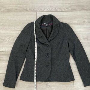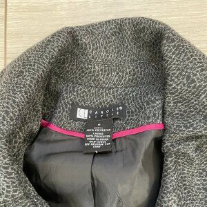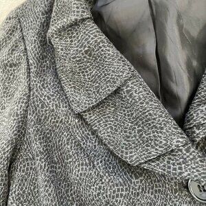 Women's Jacket-CAROLE LITTLE-Lovely women's black and gray animal print stretch knit lined button down blazer with a layered shawl collar. Jacket has a collared neckline, front button closures, no pockets, has long sleeves, and is lined. 100% Polyester. Marked Size S -see photos for measurements