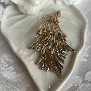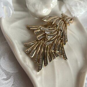Very nice rhinestone, gold-plated articulated Carolee marked brooch. No stones observed missing. Pin slightly loose, secure in clasp. Measures appx. 3 1/2".