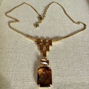 This striking CAROLEE statement necklace features a dazzling geometric drop made up of rich rectangular brown crystals, anchored by a large faceted smoky brown gem. The gold-tone chain is accented with round crystals for extra sparkle. Finished with the signature CAROLEE heart tag and a lobster clasp.