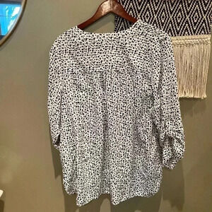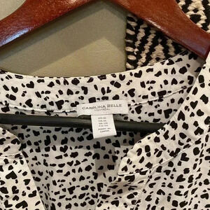 Size 1X. Carolina Belle Montreal black white polka dot/cow print like blouse. V neck. Excellent used condition. Reasonable offers welcome!