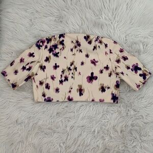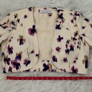 This super cute water-color floral bolero jacket is in excellent condition, fully lined and very comfortable. It would look adorable over a solid color dress and/or with a t-shirt and jeans. Though the tag reads a size 8, I am a size 4-6 and it fits me perfectly. Please see photos for measurements. Happy to answer any questions. All items are shipped from a smoke-free, pet-free environment.