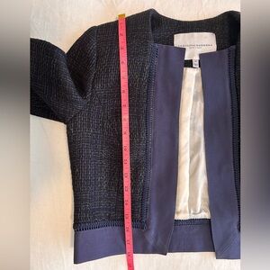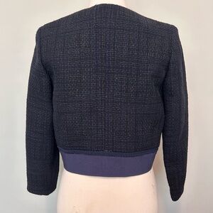 This is a Carolina Herrera cropped open-front jacket with a navy and black tweed-like texture.