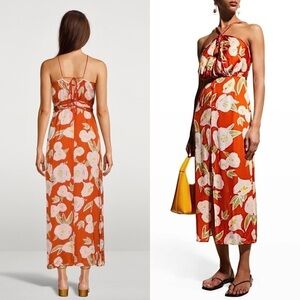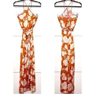 CAROLINA K 70s Floral Satin Sleeveless Halter Tie Waist Front Slit Maxi Dress XS