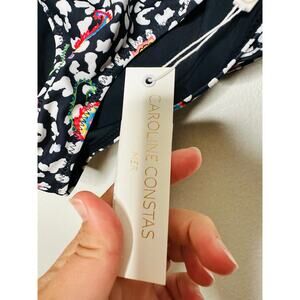 The Caroline Constas Anastasia two-piece swimsuit is a striking blend of romantic detail and bold print, perfect for making a statement poolside or at the beach. The bikini top features a flattering deep scoop neckline with underwire cups for support, complemented by ruffled shoulder straps that add a touch of femininity. Its unique paisley leopard print in black and white offers a modern twist on classic patterns. The top secures at the back with a hook-and-eye closure, ensuring a comfortable fit. Crafted from a blend of 75% polyester and 25% elastane, with a lining of 91% polyester and 9% elastane, it promises both durability and comfort.