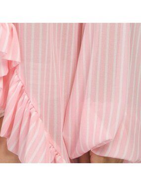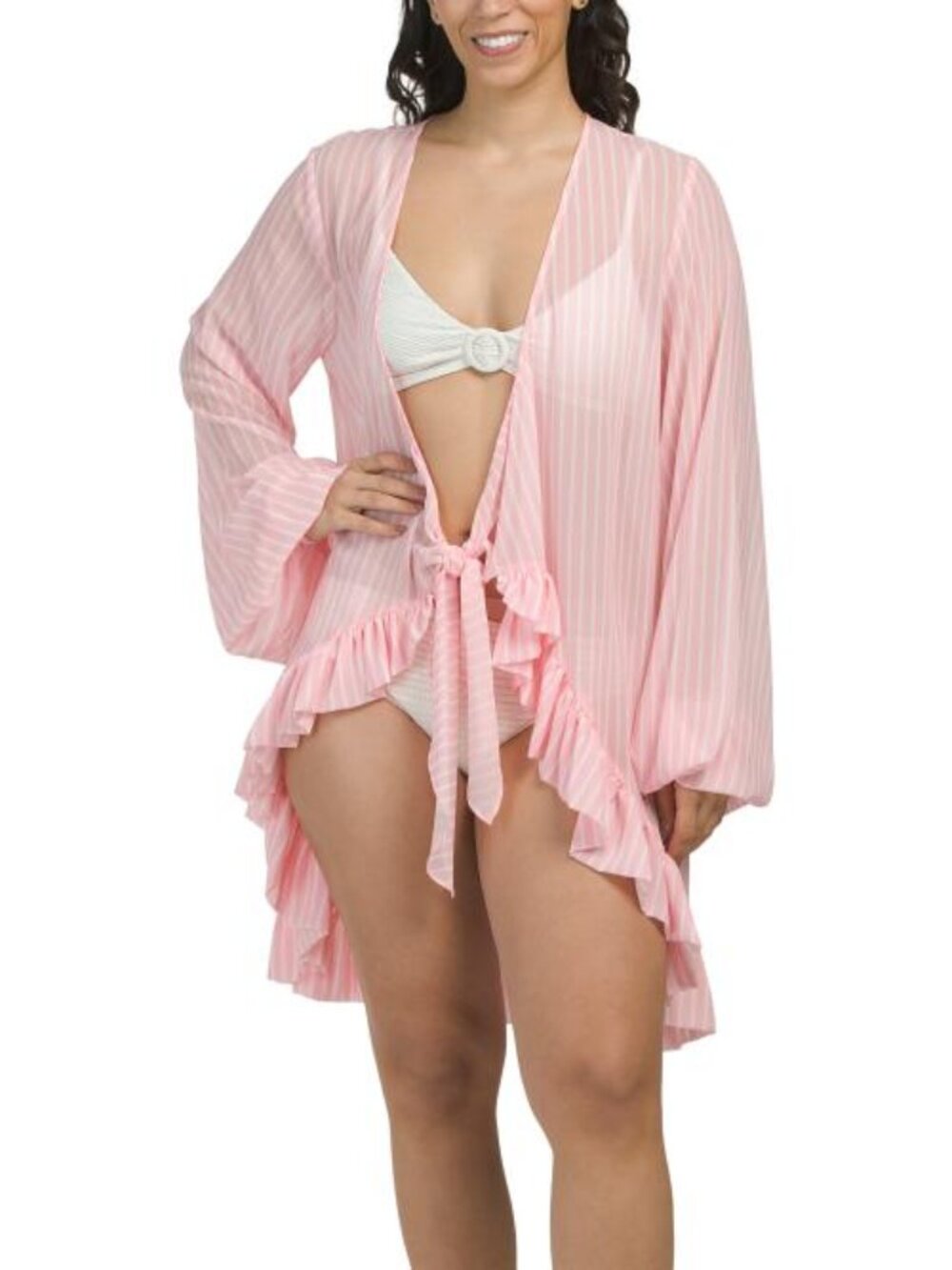 striped pattern, long sleeve, front tie closure, ruffle hem