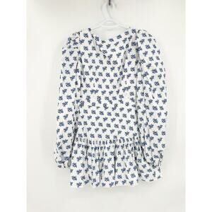 Blue and white cotton blend (70% Cotton, 28% Polyester, 2% Spandex). Full skirt. Square neckline. Long sleeves. Side zipper closure.