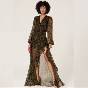 A low-cut surplice neckline and a leg-revealing ruffled hem add the perfect amount of allure to this ethereal