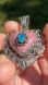 This is a vintage Te Amo Rhodonite pendant enhancer by Carolyn Pollack. It is a large Rhodonite heart set in 925 sterling silver with a pretty open filigree pattern around it and scalloped bezel. It features a beautiful blue oval opal in the center with a small scalloped silver patter around that. It is Southwestern style, from the Sincerely Southwest collection.