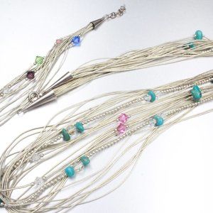 This astounding set by Carolyn Pollack Relios features a 14 long strands of liquid sterling silver with lovely green turquoise stone and faceted floating glass beads in four different colors such as pink, blue, green and purple. One of the strands is composed of round beads strung together. Both sets are in beautiful condition with minor tarnishing. The long necklace is 29" long and the bracelet is 7 5/8" long.