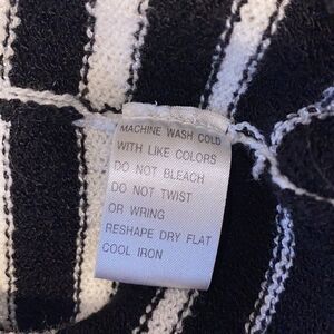 Washable acrylic knit in a white with black stripe pattern, short sleeve, crew neck, ribbed cuffs and hem. Excellent condition. Size medium, measures 18” from armpit to armpit and 25” from top of shoulder to bottom hem.