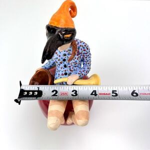 Woman with beak hat sitting on an apple , painted and glazed ceramic sculpture, signed underneath, 8.5" tall, 4" wide.