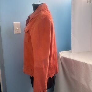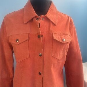 CARRIE ALLEN suede leather in pumpkin orange the perfect lightweight leather jacket for autumn days.