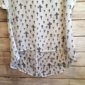 EXCELLENT CONDITION CARRIE ALLEN SHEER TOP IN CROSS PRINT SIZE LARGE PIT TO PIT 20 INCHES SHOULDER TO HEM 24-31 INCHES 100%
