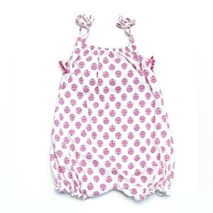 Adorable CARTER’S pink & purple floral pattern ROMPER. Features ruffled neckline and knotted straps. Snap button closures for easy diaper changes.