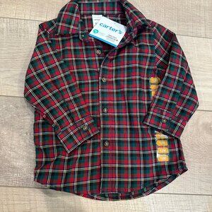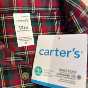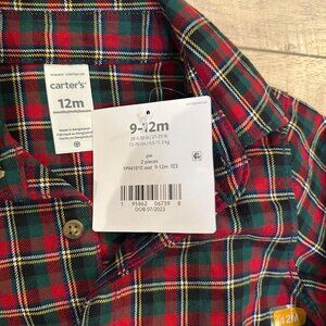 This adorable Carters outfit features a green and red plaid shirt paired with khaki pants, perfect for your little one. Made with quality materials, this new ensemble offers style and comfort for any occasion.