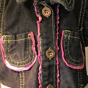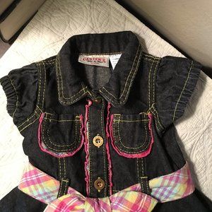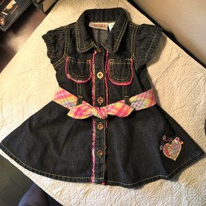 Sweet little denim shirt dress with a flared skirt that buttons all the way down the front with a pink plaid self-tie belt. Belt has tack in the back so it stays put (and won't get lost!). Narrow pink plaid ruffle down the placket front and along the two tiny chest pockets.