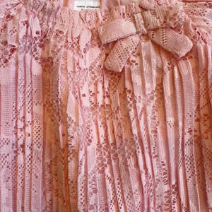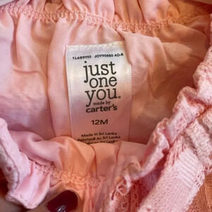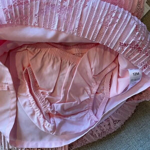 Carters just one you pink lace dress. So sweet for special occasions, With pretty lasercut florals, ruffled neckline + flowy cap sleeves, this one's ready to twirl. New with tags. Plus, it's machine washable! Comes with bloomers.