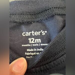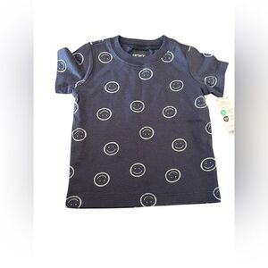 Adorable baby outfit set with a navy shirt featuring a cute pattern and gray striped overalls. Perfect for any occasion.