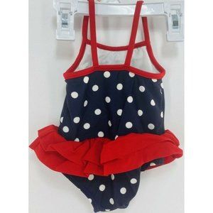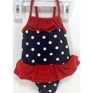 CARTERS RED BLUE AND WHITE POLKA DOT RUFFLED ONE PIECE BABY SWIMSUIT SIZE: 6 M