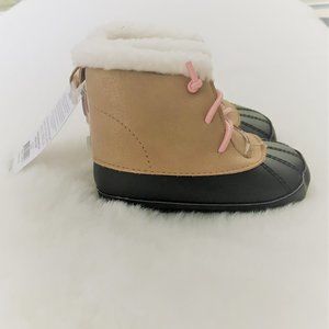 New with Tags | Carter's Baby Girl Fleece Lined Duck Boots | Size 6-9 Months | Padded Insoles and Collars | Lace Up Design | Faux Fur Trim | Faux Suede & Faux Leather Upper with Locker Loops | Crib Shoe Size Conversion: Size 3 = 6 to 9 Months