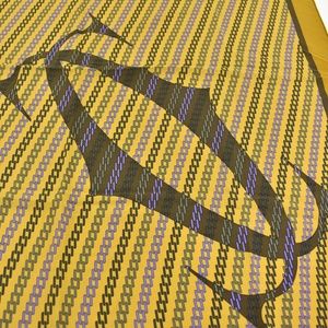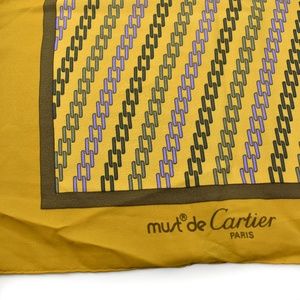 "Must de Cartier" - Deep Goldenrod Yellow, 100% silk scarf/foulard with blue/purple link pattern accented by large, signature "Double C" logo at center and "must de Cartier" logo at bottom corner
