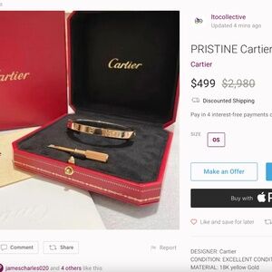 Cartier Frauds SAME SCAMMERs, ALL new or hacked account with a same pics, stolen pics & conveniently under 500. STOP BUYING THESE ILLEGAL counterfeits, they're $25 steel rubbish from DHgate. Im not sure why anyone would think an authentic cartier love bracelet retailing at 8K would sell for under $499. It's hilarious when people ask if authentic & the scammer says yes, DO SOME research, look at the prices on cartier website if you're not familiar. They mark under 500 to bypass authentication to send garbage (NOT CARTIER OR GOLD, $2 steel), some alter shipping label sending nothing to another address which will show as delivered to buyer. Sometimes they mark over 500 but send offers under 500 to trick buyer to thinking it'll be authenticated but it WILL NOT be when under 500 even if listed over. REPORT these FRAUDS INSTEAD OF ENCOURAGING IT!