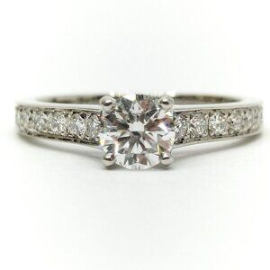Absolutely stunning authentic Cartier Solitaire Diamond Ring in luxurious platinum (Pt 950). Features a 0.4ct round brilliant diamond, color E, clarity VVS2, with 3EX cut grade—the highest standard for brilliance. Flanked on each side by 9 graduated diamonds (18 total side stones) that add sparkle and elegance. Estimated total carat weight: ~0.8ct. Ring size is US 3.75 / JPN 6 / EU 46. Serial number 40300F. Gross weight: 2.9g. This ring was verified by Cartier at Takashimaya and includes original Cartier box and a copy of the GIA certificate. Light, unnoticeable surface scratch—otherwise in excellent pre-owned condition. This exact quality ring would retail at Cartier for well over $10,000. Crafted with Cartier’s signature attention to detail, design, and premium materials. Cartier is one of the world’s most prestigious jewelry houses, known for unmatched craftsmanship and timeless beauty. A rare opportunity to own a verified luxury ring at a fraction of the price. 100% Authentic. Willing to meet at a Cartier boutique for verification if needed. Make sure to know your ring size before purchasing—resizing platinum rings can be costly. Priced to sell. A true heirloom-quality piece.