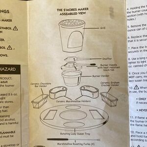 CASA MODA Indoor Outdoor S'Mores Maker Set....complete unused clean new. Original paperwork included but no original outer box. Parts include: Grill, snuffer, burner handle with heat resistant black tab, burner holder, four ceramic holders for chocolate, graham crackers, marshmallows, rotating lazy Susan tray and four marshmallow roasting forks. UNUSED NEW CONDITION!