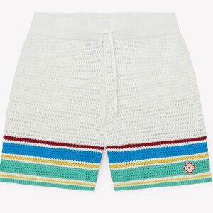 Casablanca Bermuda shorts made of striped crochet with a small logo patch applied on the left leg.
