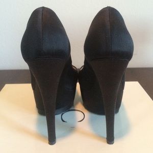 Worn ONCE!!! Black Shimmering satin. Triple-stacked platform. Crescent-toe pump's 2" platform features stacked, upturned detail. Low vamp. 5 1/2" covered heel. Finished with leather lining. Made in Italy.